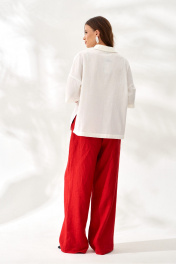 Брюки женские из льняной ткани прямые широкие длинные на притачном широком поясе с резинкой. По передним половинкам боковые карманы с отрезным бочком и имитация застежки с гульфиком. Низ брюк обработан с закрытым срезом.