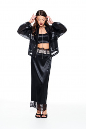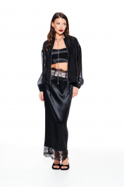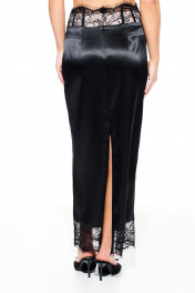 Юбка из струящейся ткани с блеском, прямого силуэта, с застежкой на потайную молнию в среднем шве спинки. Пояс из контрастной ткани, отрезной, оформлен тесьмой из кружева с имитацией корсета, на обтачке. По верхнему срезу переднего полотнища заложены три горизонтальные складки. Заднее полотнище с талиевыми вытачками и средним швом, заканчивающимся разрезом. Нижний срез обработан тесьмой из кружева.