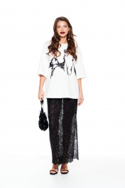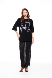 Юбка из трикотажного кружевного полотна в пайетки с притачными шортами, прямого силуэта, с разрезом в левом боковом шве. Пояс на резинке. Длина юбки до щиколотки. Шорты выполнены из трикотажной подкладки.