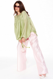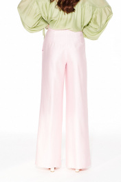 Брюки свободного объема, расширенные книзу. На передних половинках выполнены боковые карманы с отрезным бочком и встречные складки. На задних половинках талиевые вытачки. Застежка – гульфик на молнии. Пояс притачной, с резинкой по спинке, застежкой на крючок и потайную пуговицу.