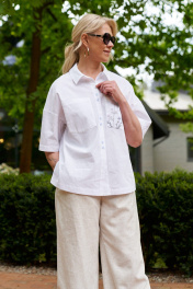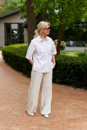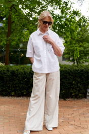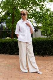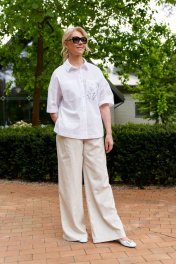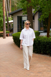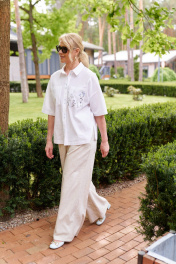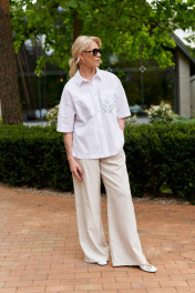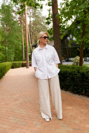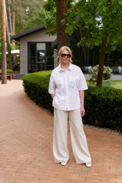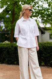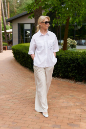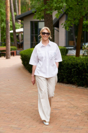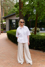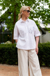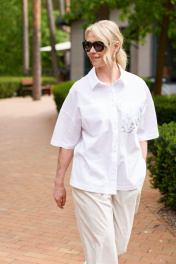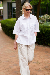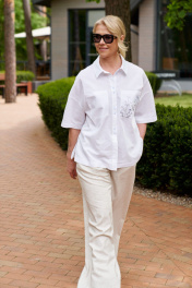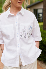 Блузка женская, свободного силуэта, длиной выше линии бёдер из хлопковой плательно-блузочной ткани со спущеной линией плеча. Перед с накладными карманами, на левом-декоративная вышивка, цельнокроенными планками и застёжкой на петли-пуговицы. Рукав одношовный, длиной до локтя. В боковых швах имеются разрезы. Воротник рубашечный на отрезной стойке. Низ блузки фигурный.