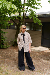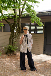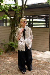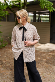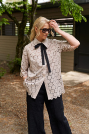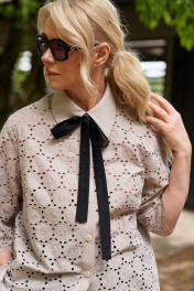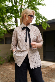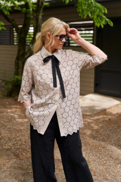 Блузка женская, свободного силуэта, длиной ниже линии бёдер из хлопковой плательно-блузочной ткани с декоративной вышивкой (ришелье), со спущеной линией плеча. Перед с нагрудными вытачками, отрезными планками и застёжкой на петли-пуговицы. Рукав одношовный, длиной до локтя. В боковых швах имеются разрезы. Воротник рубашечный на отрезной стойке. Планки, воротник,стойка из однотонной хлопковой ткани-компаньона. Низ блузки и низ рукава с фигурными фистонами. В комплекте с блузкой имеется контрастный бант-завязка.