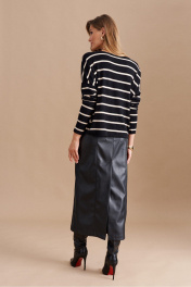 Джемпер женский свободного кроя из трикотажного полотна в полоску. Рукав длинный втачной. Горловина переда в форме лодочки, горловина спинки V- образная. Спинка со средним швом. Длина изделия до линии бедер. Доступен к носке аверс-реверс.