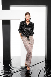 Блузон прямого силуэта, укороченная с регулирующимся шнуром по низу. Перед с нагрудными вытачками, выходящими из бокового шва и потайной планкой с застежкой на петли-пуговицы. Рукав реглан,снизу кулиса . Воротник рубашечный на отрезной стойке.