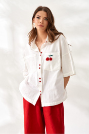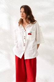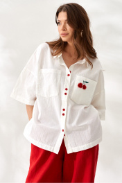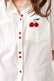 Блузка-рубашка из хлопковой ткани, прямая свободная со спущенным плечом, центральной застежкой на петли и контрастного цвета пуговицы, длиной ниже линии бедер. По полочкам в верхней части симметричные накладые карманы, на левом кармане вышивка "вишенки". Спинка цельная. Низ прямой, в боковых швах разрезы. Рукав одношовный короткий. Воротник рубашечный отложной на притачной стойке.
