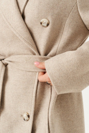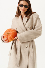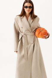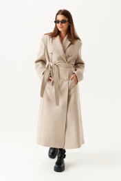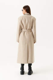 Пальто из пальтовой ткани, прямого силуэта, свободное, со спущенной линией плеча, с центральной двубортной застежкой на петли и пуговицы, отложным воротником и лацканами пиджачного типа, на подкладке. Полочки с отрезными бочками и карманами в швах. Спинка со средним швом и шлицей, с отрезными бочками и плечевыми вытачками. Рукав втачной, длинный, двухшовный. В комплекте пояс из основной ткани.