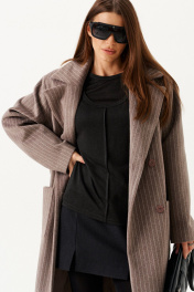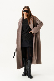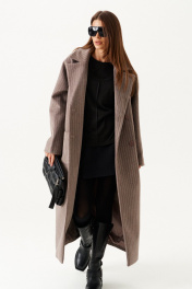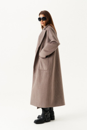 Пальто из трикотажного полотна, прямого силуэта, свободное, с центральной двубортной застежкой на петли и пуговицы, отложным воротником и лацканами пиджачного типа, на подкладке. Полочки с накладными карманами. Спинка цельная. Рукав втачной, длинный,одношовный.