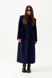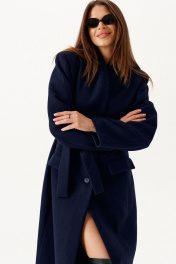 Пальто из пальтовой ткани, прямого силуэта, свободное, с центральной застежкой на петли и пуговицы, на подкладке. Воротник – цельнокроеная стойка. Полочки с отрезными бочками и прорезными карманами с клапаном и двумя обтачками. Спинка с отрезными бочками, со средним швом и шлицей. Рукав втачной, двухшовный, длинный. В комплекте пояс из основной ткани.