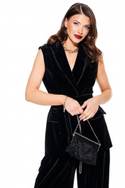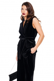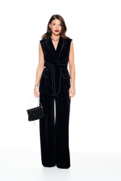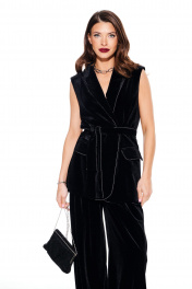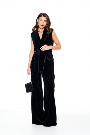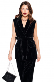 Жилет из бархата на трикотажной основе, прямого силуэта, однобортный, с отложным воротником, на подкладке. Детали переда с рельефами и прорезными карманами с клапаном и двумя обтачками. Спинка со средним швом и рельефами. Воротник, клапаны, подборта и пояс – оформлены декоративной тесьмой.