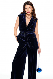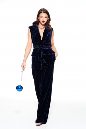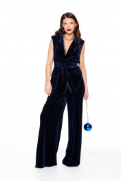 Жилет из бархата на трикотажной основе, прямого силуэта, однобортный, с отложным воротником, на подкладке. Детали переда с рельефами и прорезными карманами с клапаном и двумя обтачками. Спинка со средним швом и рельефами. Воротник, клапаны, подборта и пояс – оформлены декоративной тесьмой.