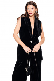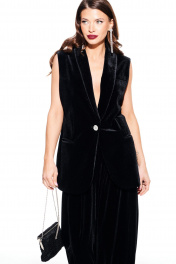 Жилет из бархата на трикотажной основе, прямого силуэта, однобортный, с центральной застежкой на 1 петлю и 1 пуговицу, на подкладке. Детали переда с талиевыми вытачками, отрезными бочками и прорезными карманами в рамку. На левой полочке нагрудный карман с листочкой. Спинка со средним швом и талиевыми вытачками. Воротник – шалевый с фигурным краем.