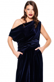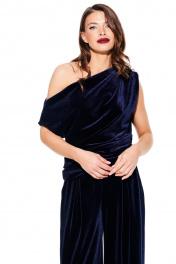 Блуза из бархата на трикотажной основе, умеренного объема, полуприлегающего силуэта с акцентом на одно плечо, с фигурной драпировкой на уровне груди. Вырез горловины в форме лодочки. Левый плечевой и боковой шов оформлены сборкой. Длина до линии бедер.