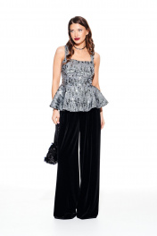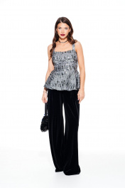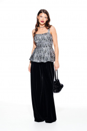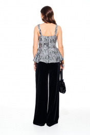 Блузка из трикотажного полотна в пайетки, приталенного силуэта, отрезная на уровне линии талии, на широких бретелях, на подкладке. Перед с отрезной кокеткой, рельефами и нагрудными вытачками. Спинка с рельефами, со средним швом и застежкой на тесьму-молнию. Нижняя часть блузки расклешенная.