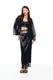 Блузон из органзы, умеренного объема, прямого силуэта, со спущенной линией плеча, с центральной застежкой на тесьму-молнию. На деталях переда горизонтальный подрез и накладные карманы с клапаном. Воротник – стойка. Спинка цельная. Нижний срез оформлен кулиской. В кулису продета декоративная тесьма для регулировки объема и формирования сборки. Рукав втачной, длинный, со сборкой на резинку по нижнему срезу.