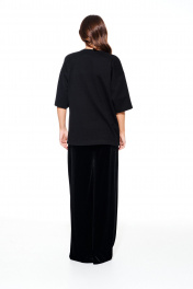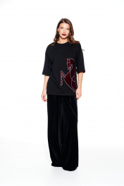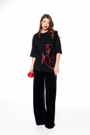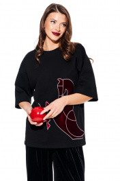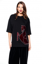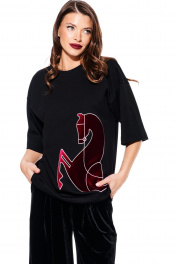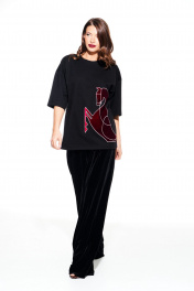 Джемпер из трикотажного полотна, прямого силуэта, свободный, с круглым вырезом горловины. Перед и спинка цельные. По переду выполнена вышивка-аппликация из бархата "Лошадь".