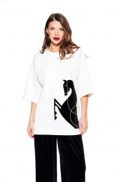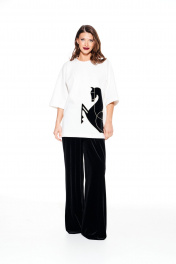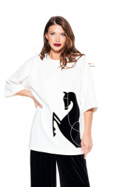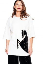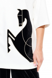 Джемпер из трикотажного полотна, прямого силуэта, свободный, с круглым вырезом горловины. Перед и спинка цельные. По переду выполнена вышивка-аппликация из бархата "Лошадь".