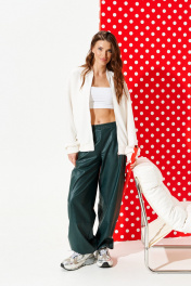 Бомбер из трикотажного полотна свободного объема, прямого силуэта, с центральной застежкой на тесьму-молнию и круглым вырезом горловины. Воротник-стойка. Детали переда и спинки с отрезной кокеткой. На левой кокетке переда выполнена вышивка «Пульс». В боковых швах расположены карманы. Рукав втачной, одношовный, длинный. Низ рукава, переда и спинки обработаны притачной манжетой.