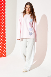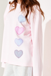 Джемпер из трикотажного полотна свободного объема, прямого силуэта, с круглым вырезом горловины. Вырез горловины обработан притачной обтачкой. Перед и спинка цельные. По переду выполнена вышивка-аппликация «Сердечки» из контрастных материалов. Рукав втачной, одношовный, длинный.