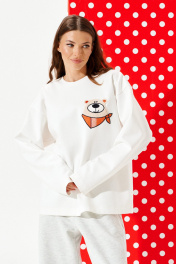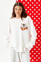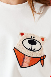 Джемпер из трикотажного полотна свободного объема, прямого силуэта, с круглым вырезом горловины. Вырез горловины обработан притачной обтачкой. Перед и спинка цельные. По переду выполнена вышивка-аппликация «Медвежонок» из контрастных материалов. Рукав втачной, одношовный, длинный.