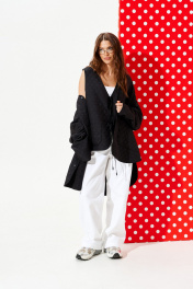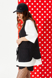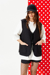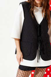 Жилетка из стеганой курточной ткани, свободного объема, прямого силуэта, с V-образным вырезом горловины. Детали переда с накладными карманами. Спинка цельная, с настрочными нашивками «Цветок» и «Сердце». Застежка центральная на завязках. Горловина, борт, рукава и низ жилетки обработаны окантовочной бейкой.