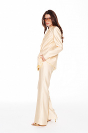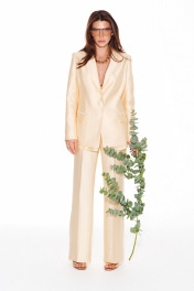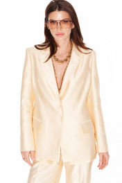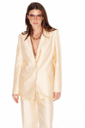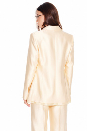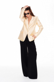 Жакет из костюмно-плательной ткани, умеренного объема, прямого силуэта, с центральной застежкой на 1 петлю и 1 пуговицу, отложным воротником и лацканами пиджажного типа, на подкладке. Детали переда с талиевыми вытачками, отрезными бочками и прорезными карманами с клапанами и двумя обтачками. Спинка со средним швом и отрезными бочками. Рукав втачной, двухшовный, длинный. Клапаны и низ изделия оформлены планками из контрастной ткани.