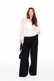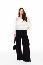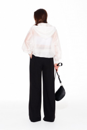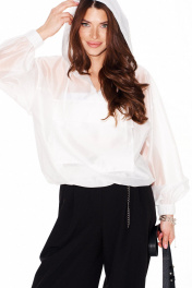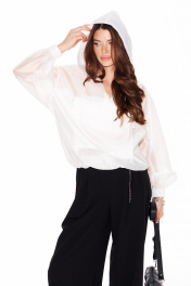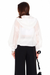 Блузка свободного объема, прямого силуэта, с капюшоном. Перед с отрезной кокеткой, V-образным вырезом горловины, накладным карманом с клапаном. Спинка цельная. Рукав втачной, одношовный, длинный. Нижний срез блузки и рукавов оформлен сборкой на эластичную тесьму. Капюшон одношовный, через обметанные петли в кулиску продет шнурок.