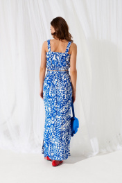 Комплект женский 2-х предметный, состоящий из блузки-топа и юбки. Блузка-топ на широких бретелях с резинкой, прилегающая, короткая. Перед с нагрудными вытачками. Спинка цельная. Верх и низ топа на резинке. Юбка женская, прямая, с цельнокроенным поясом на резинке, длиной макси, с разрезами по боковым швам. Перед цельный. Спинка со средним швом.
