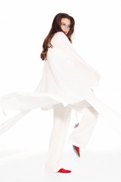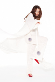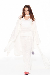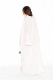 Костюм женский 3-х предметный из трикотажного полотна, состоящий из топа, брюк и кардигана. Топ умеренного объема, полуприлегающего силуэта. Вырез горловины округлой формы. Горловина и проймы обработаны притачными бейками. Брюки прямые, на притачном поясе с резинкой. Кардиган свободного объема, прямого силуэта, со съемным поясом из основной ткани. Пояс декорирован пришивными помпонами. Вырез горловины и борта обработаны цельнокроеной планкой. Боковые швы заканчиваются разрезами. Рукав втачной, широкий, длинный.