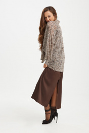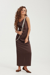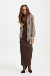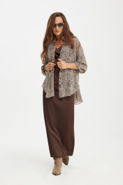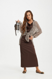Комплект женский, состоящий из платья и блузы. Платье полуприлегающего силуэта, на бретелях, с возможностью регулирования длины. Спинка платья со средним швом, заканчивающимся разрезом и талиевыми вытачками. Перед с асимметричными подрезами и горловиной типа "качель". Блуза прямого силуэта, со спущенной линией плеча. Застёжка на петли и пуговицы на планке. Воротник рубашечного типа. Спинка с кокеткой и складкой. Рукав втачной, оканчивающийся манжетой с застёжкой на петли и пуговицы. В боковых швах разрезы. Низ фигурный, разноуровневый.