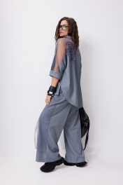 Комплект женский, состоящий из блузы и брюк. Блуза из двух видов ткани, прямого силуэта, "оверсайз", с цельнокроеным рукавом, заканчивающимся притачной манжетой. Воротник - стойка. Спинка с отрезной кокеткой из сетки, нижняя часть спинки на запах. Низ спинки фигурный. Перед с притачной горизонтальной планкой по низу, разрезами в боковых швах и втачной планкой по горловине, застёгивающейся на кнопки. Блуза декорирована настрочными элементами из сетки, в виде цветов. Брюки прямого силуэта, с декоративными отлетными элементами из сетки и хлястиками, застёгивающимися на кнопку, по переду. Брюки на притачном поясе с резинкой. В боковых швах карманы. Размер 46: Блуза: ОГ 126, ОТ 126, ОБ 126, ширина рукава на уровне низа 18, длина рукава цельнокроеного 60, длина блузы по спинке 80; Брюки: ОТ в собр. Виде 70, ОТ в раст. Виде 102, ОБ 110, ширина изделия по низу 31, длина изделия по боковому шву с поясом 104 Размер 48: Блуза: ОГ 130, ОТ 130, ОБ 130, ширина рукава на уровне низа 18, длина рукава цельнокроеного 60, длина блузы по спинке 80; Брюки: ОТ в собр. Виде 74, ОТ в раст. Виде 106, ОБ 114, ширина изделия по низу 33, длина изделия по боковому шву с поясом 104 Размер 50: Блуза: ОГ 134, ОТ 134, ОБ 134, ширина рукава на уровне низа 18, длина рукава цельнокроеного 60, длина блузы по спинке 80; Брюки: ОТ в собр. Виде 80, ОТ в раст. Виде 110, ОБ 118, ширина изделия по низу 34, длина изделия по боковому шву с поясом 104 Размер 52: Блуза: ОГ 138, ОТ 138, ОБ 138, ширина рукава на уровне низа 18, длина рукава цельнокроеного 60, длина блузы по спинке 80; Брюки: ОТ в собр. Виде 84, ОТ в раст. Виде 114, ОБ 122, ширина изделия по низу 35, длина изделия по боковому шву с поясом 104 Размер 54: Блуза: ОГ 140, ОТ 140, ОБ 140, ширина рукава на уровне низа 18, длина рукава цельнокроеного 63, длина блузы по спинке 80; Брюки: ОТ в собр. Виде 86, ОТ в раст. Виде 118, ОБ 126, ширина изделия по низу 37, длина изделия по боковому шву с поясом 104