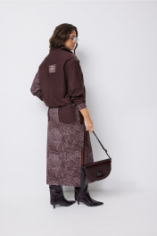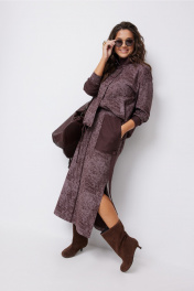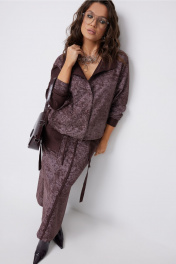 Комплект женский состоящий из бомбера и юбки. Бомбер прямого силуэта со спущенной линией плеча, на притачной манжете. Воротник-стойка, перед с центральной бортовой застежкой на кнопки и боковыми карманами ввиде листочки с втачными концами. Низ бомбера выполнен ввиде кулисы. Спинка с декоративным настрочным элементом. Юбка прямого силуэта с притачным поясом на резинке и разрезами в боковых швах. Перед со средним швом. Перед и спинка с накладными фигурными карманами. Бомбер и юбка с отделочными элементами ввиде тесьмы из основной ткани, пристегивающиеся на кнопку. Край борта, воротник, средний шов и карманы юбки выполнены с открытым срезом. Промеры Размер 46 : Бомбер : ОГ-114, ОТ-114,ОБ-114,длина изделия спинки без воротника - 59,ширина плеча-15, длина рукава втачного-56, ширина рукава на уровне ОП-23, ширина рукава на уровне низа-10. Юбка : ОТ в собр-70,ОТ в раст-104, ОБ-103, ширина изделия по низу-50,5. длина изделия по боковому шву с поясом-90. Размер 48 : Бомбер : ОГ-118, ОТ-118,ОБ-118,длина изделия спинки без воротника - 59,ширина плеча-16, длина рукава втачного-56, ширина рукава на уровне ОП-23, ширина рукава на уровне низа-10. Юбка : ОТ в собр-74,ОТ в раст-108, ОБ-107, ширина изделия по низу-52,5. длина изделия по боковому шву с поясом-90. Размер 50 : Бомбер : ОГ-122, ОТ-122,ОБ-122,длина изделия спинки без воротника - 59,ширина плеча-17, длина рукава втачного-56, ширина рукава на уровне ОП-23, ширина рукава на уровне низа-10. Юбка : ОТ в собр-78,ОТ в раст-112, ОБ-111, ширина изделия по низу-54,5. длина изделия по боковому шву с поясом-90.