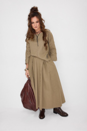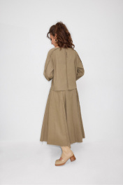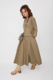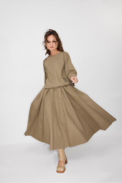 Комплект женский, состоящий из юбки и топа. Топ прямого силуэта. По переду и спинке средний шов с планками с открытым срезом. Вырез горловины - "лодочка". По переду и спинке кокетка, переходящая в рукав с планками с открытым срезом. Рукав втачной, длиной 3/4. Низ рукава и низ изделия с открытым срезом. Топ декорирован термологотипом. Юбка - шестиклинка с дополнительными клиньями в каждом шве. Застежка на потайную молнию в среднем шве заднего полотнища. В боковых швах карманы. Пояс притачной, с резинками по боковым частям, застегивающийся на петлю и пуговицу. Стачные швы клиньев и низ выполнены открытым срезом (необработаны). Размер 44: Блуза: ОГ-102, ОТ-102, ОБ-102, ширина рукава на уровне ОП-19,5, длина изделия спинки по центру-48, длина рукава цельнокроенного-53. Юбка: ОТ в собр.-60, ОТ в раст.-76, длина изделия по боковому шву с поясом-83 Размер 46: Блуза: ОГ-106, ОТ-106, ОБ-106, ширина рукава на уровне ОП-20,5, длина изделия спинки по центру-48, длина рукава цельнокроенного-53. Юбка: ОТ в собр.-62, ОТ в раст.-80, длина изделия по боковому шву с поясом-83 Размер 48: Блуза: ОГ-110, ОТ-110, ОБ-110, ширина рукава на уровне ОП-21,5, длина изделия спинки по центру-48, длина рукава цельнокроенного-53. Юбка: ОТ в собр.-64, ОТ в раст.-84, длина изделия по боковому шву с поясом-83