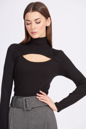 Джемпер выполнен из трикотажного полотна в мелкий рубчик. Джемпер приталенного силуэта, длиной выше линии бедер. Спереди кокетка фигурной формы с прорезью. Спинка цельная. Воротник-стойка. Рукав втачной, одношовный. Длина жакета: р.44-48 - 62 см, р.50-54 - 63 см. Длина рукава: р.44-54 - 61 см. 44 46 48 50 52 54 Длина по центру спинки 62 62 62 63 63 63 Длина рукава 61 61 61 61 61 61 Объем по груди 82 86 90 94 98 102 Объем по талии 72 76 80 84 88 92 Объем по низу 90 94 98 102 106 110 Объем рукава вверху 25 27 29 31 33 35 Объем рукава внизу 18 18 18 19,5 19,5 19,5