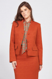 Комплект: жакет + юбка. Комплект выполнен из твида. Жакет прямого силуэта, длиной выше линии бедер. Застежка спереди центральная бортовая на пуговицы. Спинка со средним швом. Горловина V-образной формы, воротник-стойка. Рукав втачной, двухшовный. Жакет на притачной по низу подкладке. Юбка заужена к низу, на притачном поясе, длиной миди. Застежка сзади на потайную молнию и пуговицу. Переднее полотнище цельное. Сзади в среднем шве разрез. Юбка на отлетной по низу подкладке. В комплект входит ремень из основной ткани с обтяжной пряжкой. Блузка продается отдельно м.2459. Длина жакета:р. 44-48 - 56 см, р. 50-54 -57 см. Длина рукава - 63 см. Длина юбки с поясом - 75,5 см. 44 46 48 50 52 54 ЖАКЕТ Длина по центру спинки 56 56 56 57 57 57 Длина рукава 63 63 63 63 63 63 Объем по груди 94 98 102 106 110 114 Объем по талии 84 88 92 96 100 104 Объем по бедрам (низу) 96 100 104 108 112 116 Объем рукава вверху 36 38 40 41 43 45 Объем рукава внизу 26 26 26 28 28 28 ЮБКА Длина по переду 75,5 75,5 75,5 75,5 75,5 75,5 Объем по талии 72 76 80 84 88 92 Объем по бедрам 96 100 104 108 112 116 Объем по низу 78 82 86 90 94 98 Ширина пояса 3,5 3,5 3,5 3,5 3,5 3,5