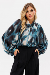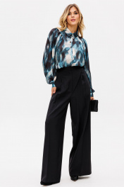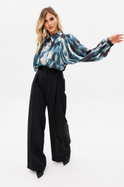 Брюки-палаццо выполнены из костюмной ткани. Брюки на притачном поясе, длиной в пол, по бокам лампасы из атласа, складки и боковые карманы. Застежка спереди на молнию. Передняя и задняя часть брюк заутюжены на кант. Длина брюк с поясом - 115 см.