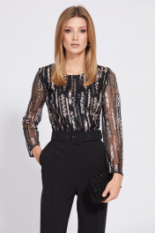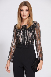 Комбинезон отрезной по линии талии. Лиф выполнен из сетки с вышивкой. Брюки выполнены из костюмно-плательной ткани. Застежка на потайную молнию в среднем шве спинки. Горловина округлой формы. Рукав втачной, одношовный. Перед и спинка лифа на подкладке. Брюки длиной в пол. Спереди накладные карманы. Брюки соединяются с лифом втачным поясом. В комплект входит ремень из основной ткани. Длина: 158 см. Длина рукава - 61 см. 44 46 48 Длина по центру спинки 158 158 158 Длина рукава 61 61 61 Объем по груди 92 96 100 Объем по талии 73 77 81 Объем по бедрам 98 102 106 Объем рукава вверху 33 35 37 Объем рукава внизу 23 23 23 Длина по боковому шву 118 118 118 Объем по бедрам 98 102 106 Объем по голени 47 48 49 Ширина пояса 4,8 4,8 4,8