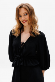 Платье выполнено из плательной ткани. Платье Х-образного силуэта, длиной миди, отрезное по линии талии. Горловина V-образной формы с завязками. На спинке в среднем шве застежка на потайную молнию. Плечевой шов укорочен. Рукав втачного покроя, одношовный, длиной 3/4 с вытачками по окату. Рукав расширен к низу, присборен на эластичную тесьму. Юбка расширена к низу. На заднем полотнище средний шов. В левом боковом шве обработан разрез. Длина платья: р. 42-46 - 140 см, 48-54 - 141 с Длина рукава: р. 42-46 - 48 см, р. 48-52 - 49 с 42 44 46 48 50 52 Длина по центру спинки 140 140 140 141 141 141 Длина рукава 48 48 48 49 49 49