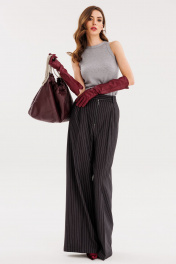 Брюки выполнены из костюмно-плательной ткани в полоску. Брюки длиной в пол, на притачном поясе. Спереди складки, боковые карманы с наклонным входом и застежка на металлическую открытую молнию. Пояс застегивается на смещенный брючный крючок и потайную пуговицу. Длина брюк: р. 42-46 - 118 см,р. 48-52 - 119 см. Гарантийный срок не установлен ГОСТ 25295 - 2003 42 44 46 48 50 52 Длина сбоку 118 118 118 119 119 119 Объем по талии 69 73 77 81 85 89 Объем по бедрам 96 100 104 108 112 116