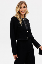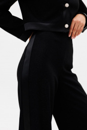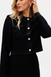 Комплект: жакет + брюки. Комплект выполнен из костюмной ткани с блескоЖакет прямого силуэта, до линии талии. Спереди рельефные декоративные карманы, застежка на пуговицы. На спинке средний шов. Горловина округлой формы. Край борта и низ жакета обработаны планкой из отделочной ткани. Рукав втачной, двухшовный. Жакет на притачной по низу подкладке. Брюки прямого силуэта, длиной до пола, без пояса. По боковым швам лампасы из атласа. Сзади в среднем шве застежка на потайную молнию. Длина жакета: 44 сдлина рукава: 62,5 см Длина брюк: 114, 5 см