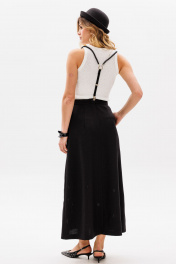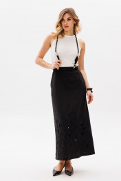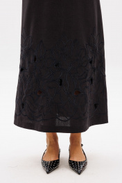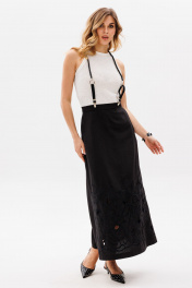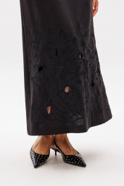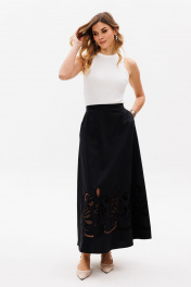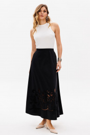 Юбка выполнена из плательной ткани. Юбка А-образного силуэта, длиной миди. Юбка на притачном поясе. Сзади в среднем шве застежка на потайную молнию. В боковых швах карманы с наклонным входом. Юбка декорирована по низу переда вышивкой с перфорацией. Длина юбки: р. 44-48 - 93,5 см, р. 50-54 - 94,5 см. 44 46 48 50 52 54 Длина по переду с поясом 93,5 93,5 93,5 94,5 94,5 94,5 Объем по талии 72 76 80 84 88 92 Объем по бедрам 98 102 106 110 114 118 Объем по низу 148 152 156 160 164 168 Ширина пояса 3,5 3,5 3,5 3,5 3,5 3,5