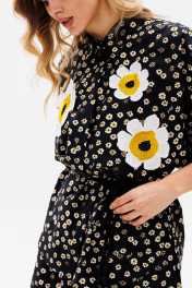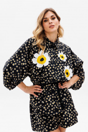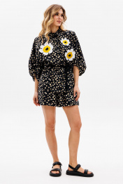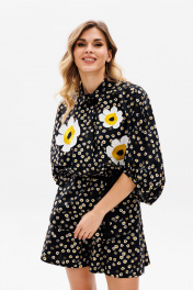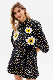 Комплект: блузка + шорты. Комплект выполнен из плательной ткани с принтом. Блузка прямого силуэта, свободного покроя "кимоно". Спереди застежка с потайной планкой на пуговицы. Горловина округлой формы, стояче-отложной воротник с отрезной стойкой. Рукав цельнокроеный, двухшовный, длиной ниже линии локтя, расширенный к низу. Низ обработан бейкой. Низ блузки фигурной формы. Перед декорирован аппликацией в виде цветов. Шорты прямого покроя, на притачном поясе с эластичной тесьмой, в боковых швах обработаны карманы. В комплект входит съемный пояс в виде шнура. Длина блузки: 74 см. Длина рукава: 54 см. 42 44 46 БЛУЗКА Длина по центру спинки 74 74 74 Длина рукава от горловины 54 54 54 Объем по груди Объем по талии 106 110 114 Объем по низу Объем рукава вверху 74 74 74 Объем рукава внизу 38 38 38 ШОРТЫ Длина сбоку 40 40 40 Объем по талии 66/98 70/102 74/106 Объем по бедрам 144 148 152 Ширина пояса 5 5 5