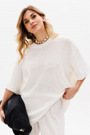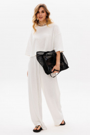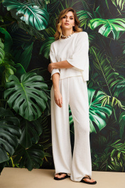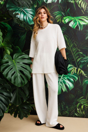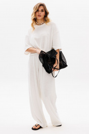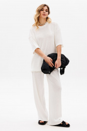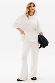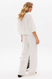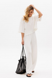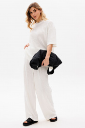 Брюки выполнены из трикотажного полотна. Брюки прямые, длиной в пол. Брюки на цельнокроеном поясе с эластичной тесьмой. Длина брюк: р. 44-48 - 110 см, р. 50-54 - 111 см. 44 46 48 50 52 54 Длина сбоку 110 110 110 111 111 111 Объем по талии 66/110 70/114 74/118 78/122 82/126 86/130 Объем по бедрам 110 114 118 122 126 130 Ширина пояса 4 4 4 4 4 4