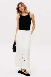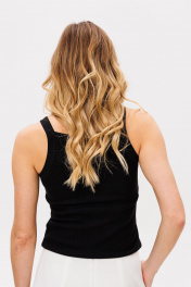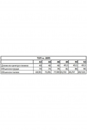 Топ выполнен из трикотажа в рубчик. Топ приталенный, длиной выше линии бедер. Перед и спинка цельные. Горловина переда и спинки окантованы. Длина: р. 42-46 - 48 см, р. 48-52 - 49,5 см.