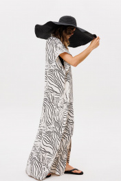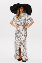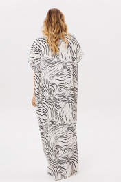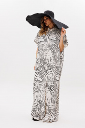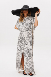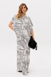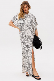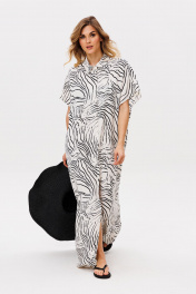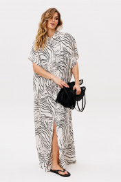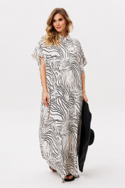 Платье выполнено из плательно-блузочной ткани с абстрактным принтом. Платье прямого силуэта, длиной в макси. Спереди центральная застежка до верха. Спинка цельная. Воротник стяче-отложной, с отрезной стойкой. Плечевой шов удлинен. Пройма углубленная. Длина: р. 42-46 - 140 см, р. 48-54 - 141,5 см.