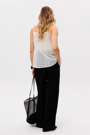 Брюки выполнены из плательно-костюмной ткани. Брюки прямого силуэта, на притачном поясе с эластичной тесьмой, длиной в пол. Спереди боковые карманы с наклонным входом. Длина брюк с поясом: р.44-48 - 112 см, р.50-54 - 113,5 см.