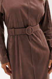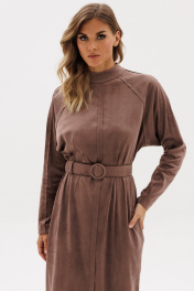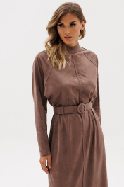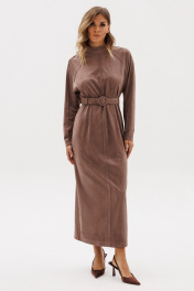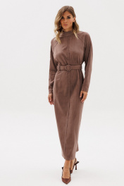 Платье выполнено из тонкой искуственной замши. Платье полуприлегающего силуэта, длиной миди. Платье отрезное по линии талии. Спереди и на спинке талиевые вытачки и средний шов. Застежка на потайную молнию в среднем шве спинки. Воротник-стойка. Рукав покроя реглан. Средний шов переда, талиевые вытачки, верхний шов рукава и линии реглана обработаны "на лицо". В комплект входит съемный ремень из основной ткани с обтяжной пряжкой. Длина платья: р.44-48 - 130 см, р. 50-54 - 131,5 см. Длина рукава от горловины: р. 44-48 - 72 см, р. 50-54 - 73 см 44 46 48 50 52 54 Длина по центру спинки 130 130 130 131,5 131,5 131,5 Длина рукава 72 72 72 73 73 73 Объем по груди Объем по талии 84 88 92 96 100 104 Объем по бедрам 101 105 109 113 117 121 Объем по низу 96 100 104 108 112 116 Объем рукава вверху 49 51 53 53 55 57 Объем рукава внизу 23 23 23 24,5 24,5 24,5