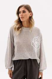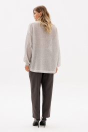 Джемпер выполнен из трикотажного полотна. Джемпер прямого силуэта, длиной до линии бедер. Перед и спинка цельные. Горловина округлой формы, обработана бейкой. Плечевой шов удлинен. Рукав рубашечного покроя, одношовный, расширенный и присборенный к низу. Низ рукава на манжете. Джемпер декорирован вышивкой шнуром по переду. Длина джемпера: р. 44-48 - 71 см, р. 50-54 - 72,5 см. Длина рукава от горловины: р. 44-48 - 75 см, р. 50-54 - 76 см 44 46 48 50 52 54 Длина по центру спинки 71 71 71 72,5 72,5 72,5 Длина рукава от горловины 75 75 75 76 76 76 Объем по груди 128 132 136 140 144 148 Объем по талии 120 124 128 132 136 140 Объем по низу 112 116 120 124 128 132 Объем рукава вверху 36 38 40 40 41 44 Объем рукава внизу 18 18 18 19,5 19,5 19,5