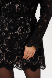Платье выполнено из гипюра. Платье Х-образного силуэта длиной выше линии колена. Застежка на потайную молнию сзади в среднем шве спинки. Воротник-стойка. Рукав втачной, одношовный. По низу рукава фестоны. Юбка расширена к низу Платье на отлетной по низу подкладке телесного цвета. В комплект входит съемный ремень из основной ткани на сонове из эко-кожи с обтяжной пряжкой и блочками. Платье с плечевой накладкой. Длина платья по центру спинки - 84 см. Длина рукава - 67 см. 44 46 48 Длина по центру спинки 84 84 84 Длина рукава 67 67 67 Объем по груди 92 96 100 Объем по талии 76 80 84 Объем по бедрам 110 114 118 Объем по низу 122 126 130 Объем рукава вверху 32 34 36 Объем рукава внизу 22 22 22