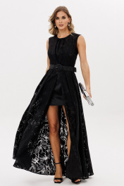 Платье выполнено из плательной ткани с принтом. Платье Х-образного силуэта, длиной в пол. Платье отрезное по линии талии. Спереди встречная складка со сборкой по центру. Горловина округлой формы. Лиф на подкладке из атласа с V-образным вырезом. Верхняя юбка расширенная к низу со складками по переду и спинке. По центру переда разрез от талии до низа. Нижняя юбка прямого силуэта, длиной выше линии колена. В комплект входит съемный ремень из атласа с обтяжной пряжкой и блочками. Длина платья: 149 см. 44 46 48 Длина по центру спинки 149 149 149 Длина рукава Объем по груди 92 96 100 Объем по талии 72 76 80 Объем по бедрам 100 104 108 Объем по низу 104 108 112