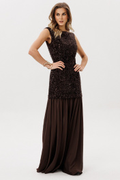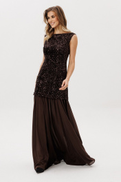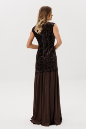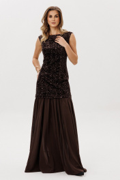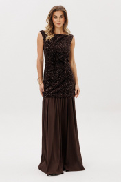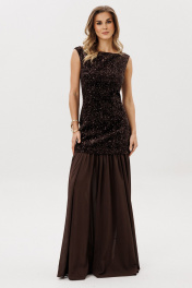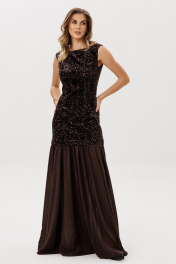 Платье выполнено из барахата с пайетками. Платье Х-образного силуэта, длиной в пол. Верх платья выполнен в виде приталенного платья длиной ниже линии бедер. Застежка на молнию с металлическими звеньями сзади в среднем шве спинки. Плечевой шов заужен. Горловина формы "лодочка". Нижняя часть платья выполнена из шифона и состоит из 8 клиньев. Верх платья на притачной по низу подкладке. Длина платья: 151 см. Гарантийный срок не установлен ГОСТ 25294 - 2003